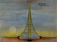 [concept drawings for Nexus mobile sea colony and Ultima 1 tower shaped arcology by Eugene Tsui]
