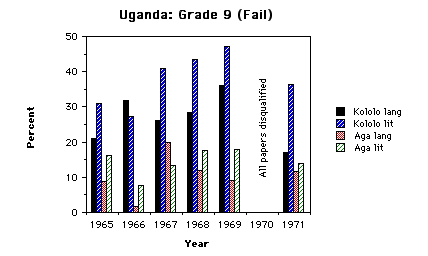 fig.3 This graph tends to show that the failure rate was variable but bad. The marked drop at Kololo in 1971 is interesting but the cause is unknown. (Many of the 1970 students retook the exam. Perhaps they had studied more in the intervening year; perhaps the weaker ones did not repeat). |