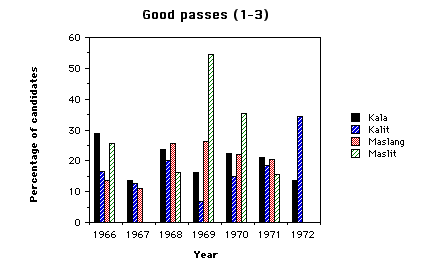 Is there a pattern in the percentage of Good passes achieved by the Kenyan students? The Kakamega students show a slight increase between 1969 (two terms of Block work) and 1970 (two years). The real change is in the Maseno literature results - from zero in 1967 to 50 percent plus in 1969 - for which there can be no explanation. |