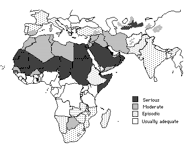 Populations rise above the ability of the water supply to give them the amount of water they need. In countries labeled here: Serious - ground water is being mined and will fail