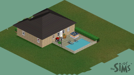 A nice starter house, or maybe for your single richer sim since the furniture is so expensive. Two bedrooms, both with queen size beds, eat-in kitchen with large dining room table, living room with big screen tv, deck with pool and a hot tub, perfect for parties!