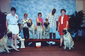 Katie is one of the puppies from the famous litter sired by CH Acorn Hills Uther Pendragon out of CH Honeycreek Spoonful of Sugar. Uther and "Ali" were Pedigree®'s Top Producing Mastiffs for 2000, and were MCOA Collar Award winners in 2001 as the Top Producing Stud Dog and Top Producing Bitch. Out of their litter of 13 puppies, 7 have earned their championships and many others have earned points toward their championships. Katie was the first bitch to finish out of the litter. (Pictured below from left: CH Honeycreek Spoonful of Lovin', CH Pendragon Everyday Hero, CH Honeycreek Sweet Surprise KT, CH Pendragon's Pecos Bill, CH Ingles Lady Lorna Sophia Cole)