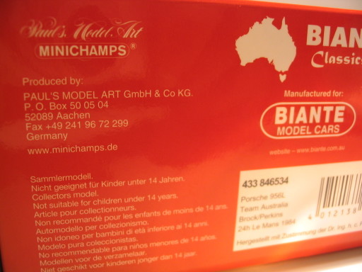 06-September-2006 This item has just been released today it's a Porsche 956 of Australian drivers Peter Brock and Larry Perkins which raced at the 24 Hours of Le Mans 1984. The model is produced exclusively for the Australian market for Biante by Minichamps and is supplied in a non standard Minichamps box with a product code of 433 846534