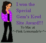 OK, now, to win my award, all you have to do is e-mail me with your site's URL, your name, and why you think you should win the award, I'll see if I like your site, and if I do send you an HTML of how to get this pretty little plaque on your site. And that's it! Good luck!