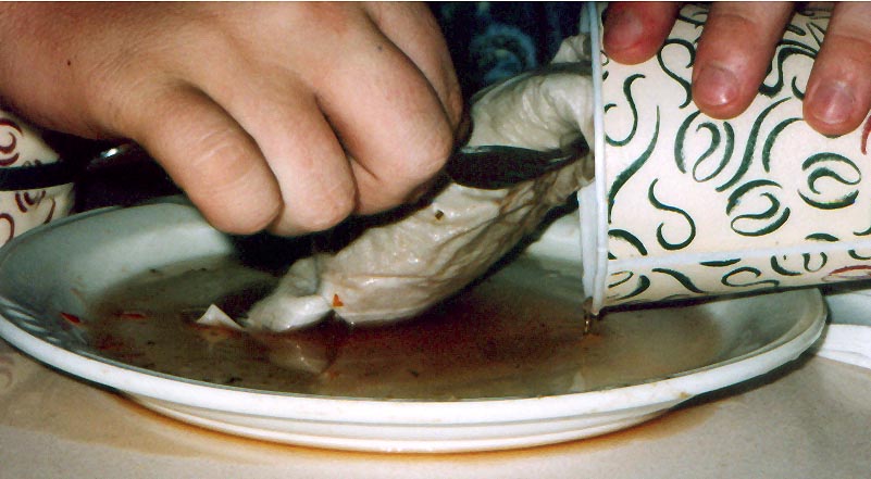 This is a mixture we made at one meal. I believe it was meat, jello & veggies all wrapped in a juice-drenched napkin. Pretty gross. (2001)