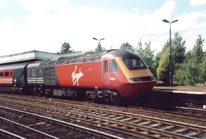 Virgin trains HST power car No.43122 'South Yorkshire Metropolitan County' at Leamington Spa station, 12/7/01.