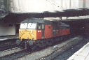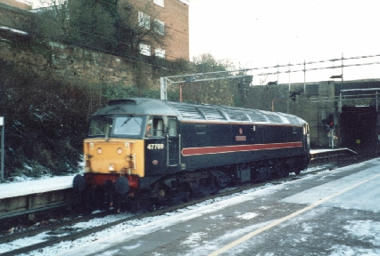 Still in RES livery class 47/7 No. 47778 'Irresistible' backs onto an awaiting electric train at Rugby because of overhead cable failure between Rugby and Coventry, 31/12/01.