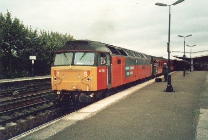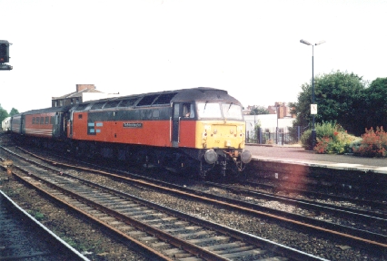 Ex - RES Class 47/7 No. 47739 shows its nameplate at Leamington Spa, 10/10/01.