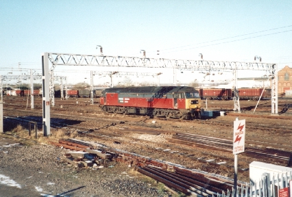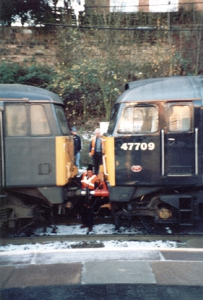 Fragonset Class 47/7 No.47709 'Dionysos' is uncoupled from 87001 at Coventry, 31/12/01.