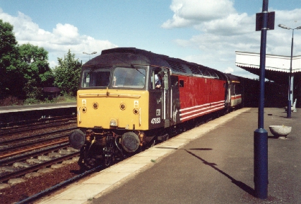 Class 47/8 No. 47853 awaits clearance from the guard to depart Leamington Spa, 7/6/01.