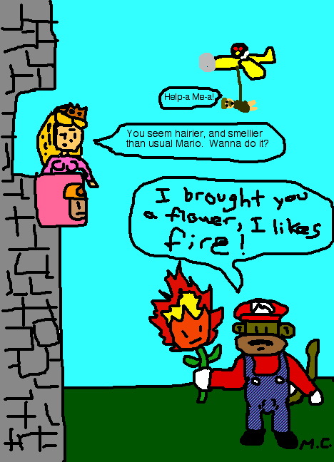Again, a picture that was suggested by Mac, I wanted to actually tell somewhat of a story with this one. You'll notice a nekkid Mario all tied up and being flown away by bam in an airplane in the background. I didn't really intend to do this, but Mac and Steve said that Munky's tail looks like a phallis in this one, but I left it and decided to make the comic about Munky trying to get jiggy with the Princess. Notice the bulge.