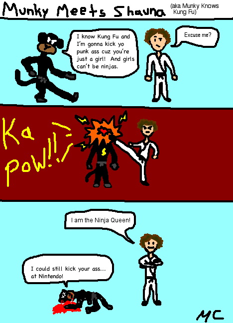 Here's another comic featuring a friend of mine, who's also a facilitator, like Matt and Ariane. Shauna's wanted me to do a comic about her and I immediately thought of her doing Tae-Kwon-Do, because she's actually a black belt. I was trying to think up an excuse for her to break Munky, and I planned on having him just challenge her to a duel of some sorts, but when she mentioned her feministic views on things the other day I thought PERFECT! and this comic was born.