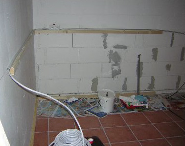 Hier sieht man den Anfang der elektrischen Arbeiten und die Rückwand der zukünftigen Holzverkleidung :