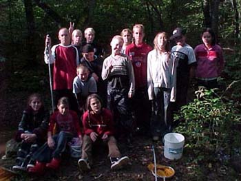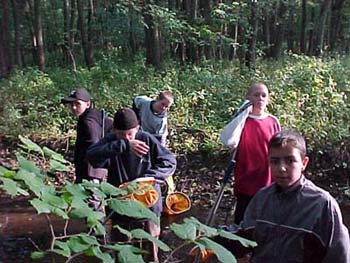 ![]() Killarna håvar och letar efter grodor i Hallabäcken. |