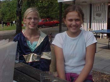 Johanna och Ena H är glada efter orienteringen och efter att ha ätit bullar och druckit saft. |