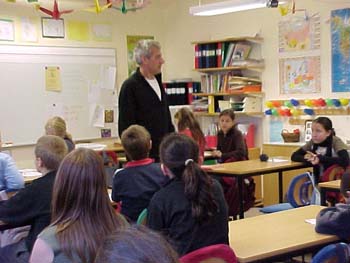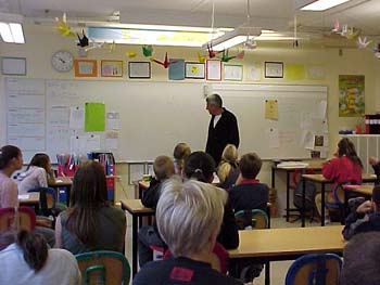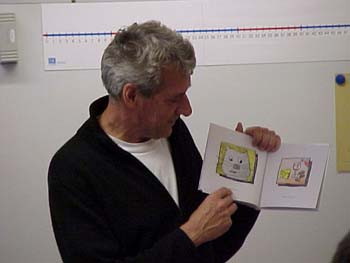 ![]() Sedan läste han en av sina böcker "En mus på fest" som han själv har ritat bilderna till. |