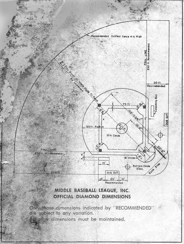 The diamond for these boys was larger than the little league diamond and smaller than the regulation baseball diamond. The figures placed on scratch paper in Ellis' office in 1951 were: 75 ft. between the rear point of home plate to the far side of first & third bases, and 53 feet between the rear point of the plate to the front side of the pitcher's rubber. It was 275 feet from home plate to the center field fence. Those measurements remained throughout the Middle Baseball League program. The program never reached it's potential because of a lack in financial aid, however, at the time this informational booklet was published (1961/62), over 3,000 boys had played in the Leagues.