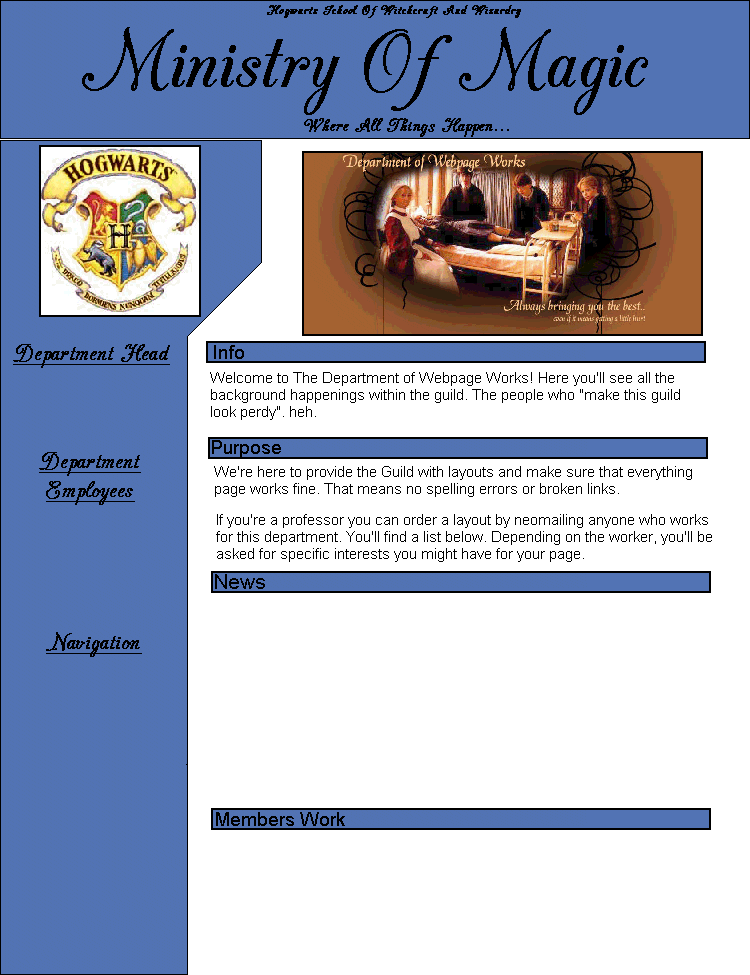 This is our new ministry of magic website! :) YAY! I am now going to start on the guild layout with all new pages and then the layout for the new year! GOAL: GET THIS DONE FOR THE NEW HOGWARTS YEAR! Anyway, pleeeeease help, neomail me or IM me at sbland26. Also i dont need help with the layout cause I have the greatest idea and its awsome....lol! Ok ... im done!