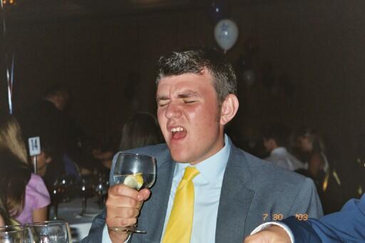 Tye...singing into a glass! I don't think it's his iced tea, which had an entire container of Sweet n Low and sugar packets dumped into it...