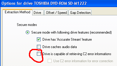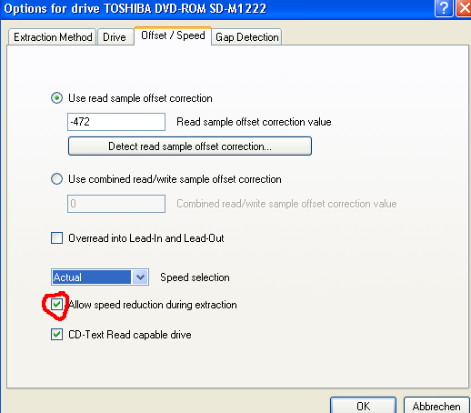 Offset / Speed tab CheckAllow speed reduction during extraction. This allows EAC to reduce the speed, if EAC finds difficult to read parts on the CD. Check CD-Text Read capable drive unless you know that your drive cannot read CD-Text (most modern drives can).