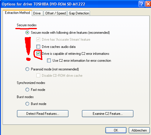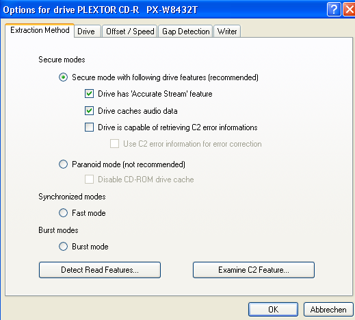 This is one of the most important parts of the configuration, because it strongly influences the extraction quality. EAC's error reporting and correction features will only work correctly if this configuration is correct and is adjusted to your personal drive; otherwise, your drive may deliver faulty extracted tracks without you knowing it.