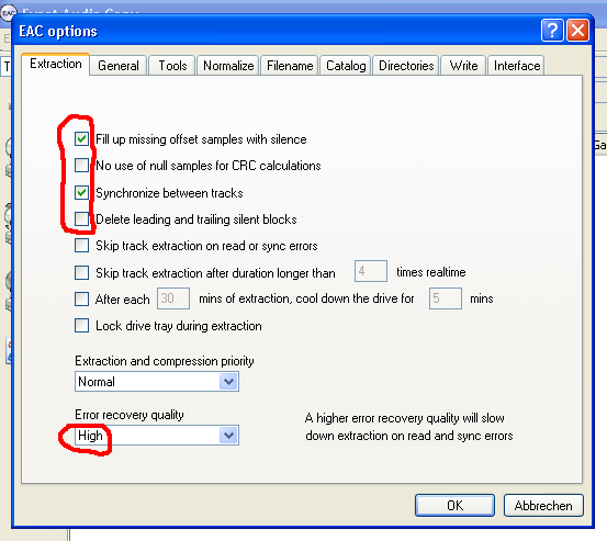 Skip track extraction after duration longer than X times realtime; enter a value between 2 and 4. This is to avoid your drive going through hours of error correction, as it often happens when errors are encountered. Most of the time, these errors cannot be corrected successfully, and there have been reports of damaged drives as a result of hour-long error correction procedures. So, enable this option for your own safety. ;-)