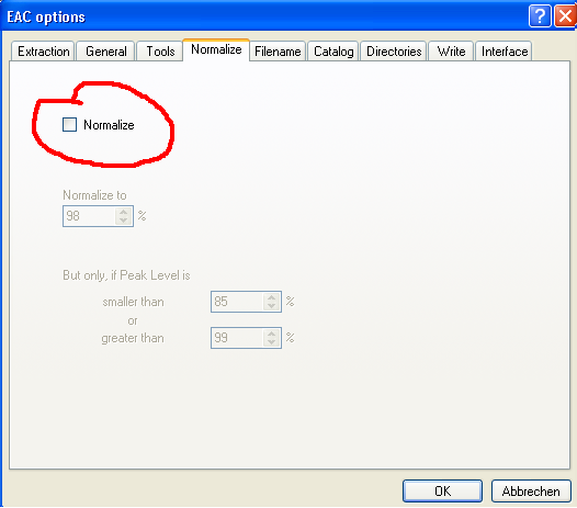 Screenshot to be 100% clear : Make sure NOT to normalise ! Disable this option by all means. Peak level normalisation destroys the dynamic range across albums, and on gapless albums (e.g. live concerts), it can introduce ugly volume differences at track junctions which should not be there. It does not make tracks sound equally loud, as many assume - you use a much smarter way without losses regarding quality to tackle that problem, called ReplayGain. More information on this is provided throughout this tutorial.