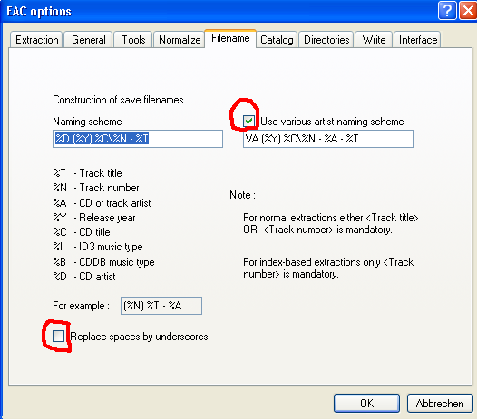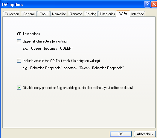 These options don't influence the extraction process, but it is a good idea to disable Upper all characters (on writing) if you ever intend to burn/write Audio CDs with EAC.