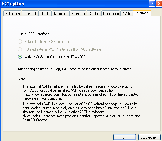 If you installed the VOB ASAPI driver, select it here (Installed external ASAPI interface). The Native Win32 interface for Win NT/2000 was reported to be unreliable. There should not be problems for Win XP & Native Win32 interface for Win NT & 2000.