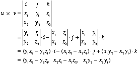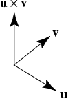 III. The Cross Product With our extension into three dimensions, we now define a third type of multiplication: the cross product (sometimes called the "vector product"). The notation is u x v, which is read "u cross v," and the result is a vector that is perpendicular to both u and v (see the diagram). The general formula for calculating the cross product of and makes use of a 3 x 3 determinant: ![]() where vector i (1,0,0) is the unit vector along the x-axis; vector j (0,1,0) is the unit vector along the y-axis; and vector k (0,0,1) is the unit vector along the z-axis. It is straightforward to show (using the dot product) that u x v must be perpendicular to both u and v. |