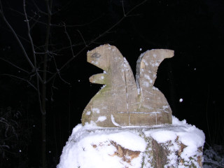 A carved Squirrel, randomly in the woods. I don't know who goes around the forest with a chainsaw, carving these things out, but it's definitely not a one-time accidental carving: There are also benches with stylistically similar owls carved onto the backs. A mystery...