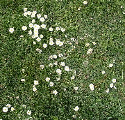 These flowers are called Gänseblümchen - I'm not sure really what we call them. The dictionaries translate it as "daisies," but that's about as accurate as calling Fleischkaese "meatloaf." I think we just don't have them, at least in the Midwest and West, which is a terrible pity. They grow close to the ground, and appear to spread like weeds. Their name comes from the feathery soft little petals.