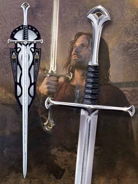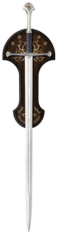 Anduril is the reforged Narsil, and is used by Aragorn, King of Gondor. The inscription down the length of the blade on both sides in the Middle-Earth language of Quenya, written in the runes of Eregion, that say "Nanye Anduril i ne Narsil i macil Elendilo. Lercuvanten i mali Mordoreo." This translates to "I am Anduril who was Narsil, the sword of Elendil. Let the thralls of Mordor flee me."