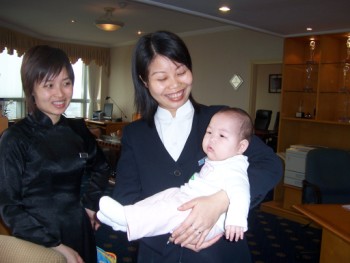 The Melia is spectacular. There was only a suite available so we are forced to go first class once again – oh, the horror of it! We have a huge living room and big master bath, a half bath and a lovely bedroom. The breakfast buffet included with our room was amazing – French toast, dim sum, cheeses, bacon, miso soup, eggs cooked to order, fruit of all kinds, and much more than I can remember. I am already looking forward to tomorrow. Oh, and the women who work there all insisted on holding Georgia while Mom and I ate. She loved it!