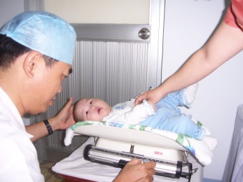 Prompt as always, Ellie reappeared at 12:30. It took over half an hour to get to the hospital. Georgia is not too fond of being out in the world. It seems that she never left the grounds of the orphanage while she was there and she is very overwhelmed by the noise and chaos of the streets (and she’s not the only one!). Once at the hospital, we waited for the “paperworker,” as Ellie called her, to come out and then Ellie went up, presumably to register us. We were called into another room and waited some more. Periodically, Ellie would ask a nurse a question. The nurses (in white starched uniforms with little white paper hats right out of the 1950s) in the waiting area were not very friendly but Ellie got right in there and got what we needed. We paid our money, waited some more, and then went to the examining room. A man measured and weighed Georgia.