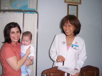 Today was a busy one. Ellie picked me up at 9:30 after she dropped my papers off at US immigration. We went to the police station to file for Georgia’s passport. It was a busy, crowded place. We waited to be called by one of four people sitting at a long table at the front of the room. After about 15 or 20 minutes, a lady called Georgia’s Vietnamese name – I actually recognized it when she called so I was pretty proud of myself, but I still have a lot of trouble saying it. She went through the papers and asked Ellie some questions. She made me “sign” my name again (they really don’t like the long signature that we use in the US) so I scribbled my initials on the papers. She smiled a couple of times and Ellie leaned over and told me that she liked Georgia and that she is cute. I was so relieved that everything seemed to be going well. She gave us a receipt for the papers and we went to the cashier. Ellie tried to hand the paper to her and the woman snapped at her and slammed the paper down on the desk – yikes! There are no instructions posted but I guess Ellie was supposed to do something different than she did. Not that she could have known, mind you! Another few minutes went by and the woman took my money. In the cab on the way back to the hotel, Ellie said that she would pick me up again at 12:30 (just two hours later) to go for the medical exam. She wanted to go early in case immigration called me for my interview.