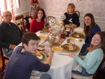 Here's a photo of our family enjoying a Christmas meal together. At the head of the table is Cousin Adam and from the left is Papaw, Holly, Aunt Marilyn, Lacy and Cousin Megan.