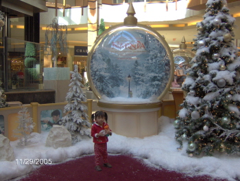 The next picture of Mollianne looking up at the snow was taken at a local mall when she was having her picture made with Santa. They had this whole deal where you walked through and saw snowglobes that had scenes from “The Chronicles of Narnia: The Lion, the Witch and the Wardrobe” in them (they were enormous – as you can see in the following photo) and right before you get to Santa, you actually go into a snowglobe and it snows on you. It was amazing and Mollianne loved it.