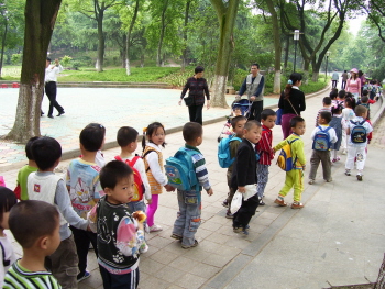 ![]() The elderly also take their grandchildren because many are babysitting for parents that work. In China, children start to school at 2 1/2 - 3 years of age, and there is no day care so the elderly must help out. Kelly and I are still trying to get a picture of the split-bottom pants worn by babies and toddlers. Yes, even the babies wear them and are actively potty-trained (children must be trained before school). Today, many teachers had brought kindergarten classes to the park. This photo shows one small class (there were probably one hundred children altogether). The children were beautiful and many were smiling and saying hello in English.