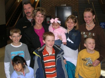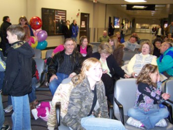 Today we would go home! We were so anxious to see the kids! Our flight was to leave Atlanta at 10:00 am and be in Des Moines at 11:30. With all of the tornadoes in the Atlanta area the day before and the blizzards in other parts of the country, many of the flights had been cancelled on Friday. There were a lot of people stranded in the airport and the flights were overbooked. They kept asking for people to volunteer to stay overnight for the next flight - but no one was interested. They then announced that they were just going to start randomly bumping people off. I was so worried that we would get bumped off and we had so many people planning on meeting us at the airport. They finally started boarding the plane an hour late. People were jamming up around the gate because nobody wanted to be the one made to stay behind. Then they announced that those with babies could board first. What a relief!! We would make it home!! The flight went fine and soon we were coming down the escalators to the area that held families waiting for travelers getting off the planes. What a group we had waiting! I think there were about 30 people and we had just had a blizzard the day before!