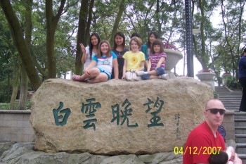 ![]() They would talk to one another (in Chinese, of course) and point and laugh. We don't know why they were laughing. One time, Sydney got caught in the middle of one of these gatherings and she said they were stroking her cheeks and hair. She didn't know what to think of that. While that was going on I was taking pictures. I looked around for Kyle and Lydia (in the stroller) and saw him off to the side. It looked to me like he was trying to hide but before I could get to him he was surrounded, too. It was pretty funny. When we got to the top of the mountain the three big girls became the center of attention. Young Chinese girls kept posing behind them for their picture...