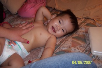 She said "Mama!" Let me repeat. She said "Mama!" She didn't exactly call me Mama. She repeated the word after me. It was very exciting. She has been saying a few words very quietly but, of course, we don't understand them. She also took a few steps today. She is pretty unsteady but once she is up and balanced she can go a couple of steps. We put her shoes on so she could hear the squeak when she walks but the shoes really threw her off. She acted like she didn't know what to do with her feet then. She also has learned to take off her socks. She prefers bare feet so she will fit right into the Ozarks... a little Asian hillbilly.