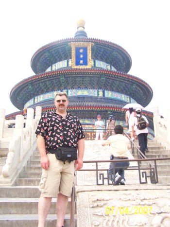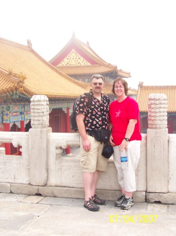 near Temple of Heaven ![]() What can we say about Beijing so far? The locals are helpful to you if you ask a question, and there is a KFC, McDonald's, and Subway. Food is CHEAP!!! We paid less than 5 dollars US for our dinner at McDonald's tonight!!! Steve bought a beer that cost about 72cents US!! Our guide is Ann and she is WONDERFUL. She is so nice and goes out of her way to help us any way she can. It was quite warm, in the 90's, with very high humidity. Steve and I are drinking a lot of water. In case anyone notices the date on the pictures is July 4th, that is because that is the date at home in Anchorage. I am not about to change the settings on the camera. To hard to fix it! We will be starting out in the morning and I will post more later. We hope everyone is well!!