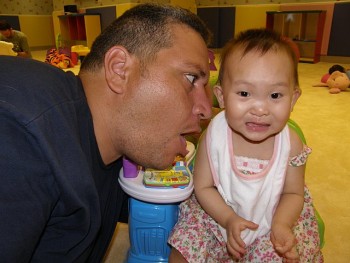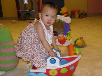 After we napped, we had dinner in the room and then we were playing and I thought I heard a motorcycle outside. Well, Mike got up to look out the window and you would have thought a tropical storm had just blown in. The noise I heard was the wind howling! We headed downstairs to check it out and the rain started. So we were off to the playroom...