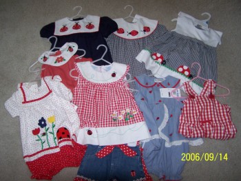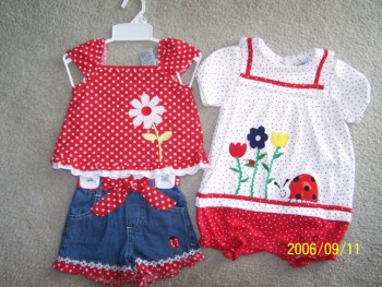 My Mother and I went shopping today looking for wall border for Emma's nursery and had no luck at all. No one in town had wall border, it's all wallpaper. And so I called my husband up and told him we need to open up a shop somewhere and carry wall border, especially for children. However, I did find these two outfits and couldn't pass them up! At $5 a pop, that's a deal! Here they are....