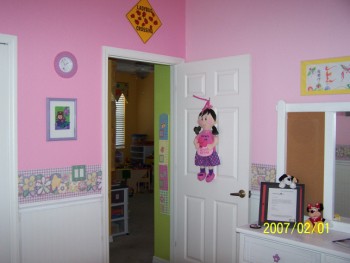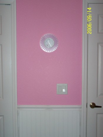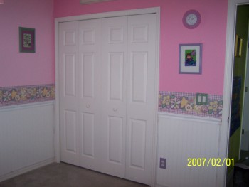 ![]() ....No peeking behind the door yet as Daddy has some of his weights in there and to me, it looks sloppy. The doll on the door did come with DARK YELLOW hair, but that couldn't be, she needs to look Chinese. So, I took a black marker and kind of painted it - looks good, huh? The walls are done, just waiting for that crib to come out of the attic in November. That's when all the Christmas stuff comes down, and the crib will once again see daylight....LOL! Ok, I can't help myself, here is ONE wall to be viewed.
