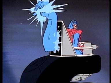 The Lancer Cycle is piloted by Ectar, who has the power to bring life to it. Its' a very quick and nimble vehicle, and 2 people can ride on it. One on the side inside the glass, and the other can sit on the rear of the vehicle. It has a very big, black, battering ram which is extendable. The cockpit at the front can create magic in the form of 2 hands that can throw fireballs and lightining, or can palm out to block oncoming attacks.