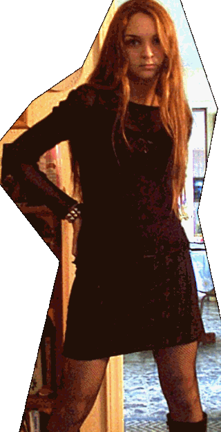 <~~ Up above we have...me...styling a fish net shirt a black mini-skirt...fish net stockings and black boots. In the picture below you just see a close up of me...which i happen to find quite sexy...Mmhmm...good, eh? lol, just joking...yup..moving on ~~>