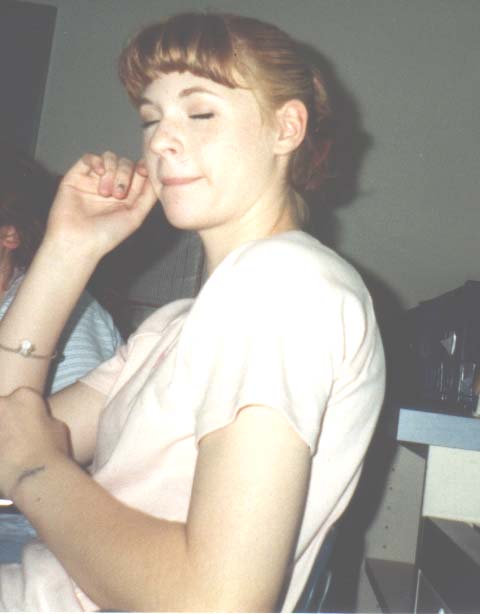 Me in my punk-rocker-pink hair stage! I was at my friend Amanda's house. That was like the first or second day of schoo, l(9th Grade).