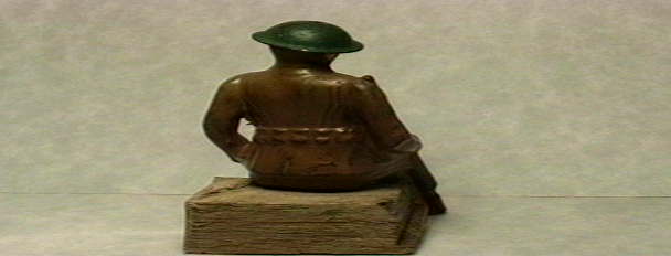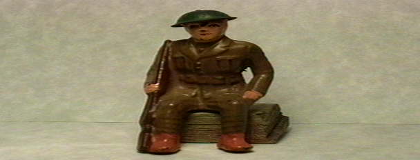 This little guy is really great. I got him from Gunnyfred who has been collecting many more years than me. Anyway, he has a tin helmet, but it's painted green. Kinda dark green too, a little darker than St Patty's Day green anyway. It is the tin helmet with a pin. Gunnyfred says some of them were. But the rest of him is just real nice too. He has some wear, but his shoes are nice and glossy orange, his rifle is brown,hands and face and washed and presentable. He has the little chip between the eyes and another on his chin. $35.00 and he's all yours!